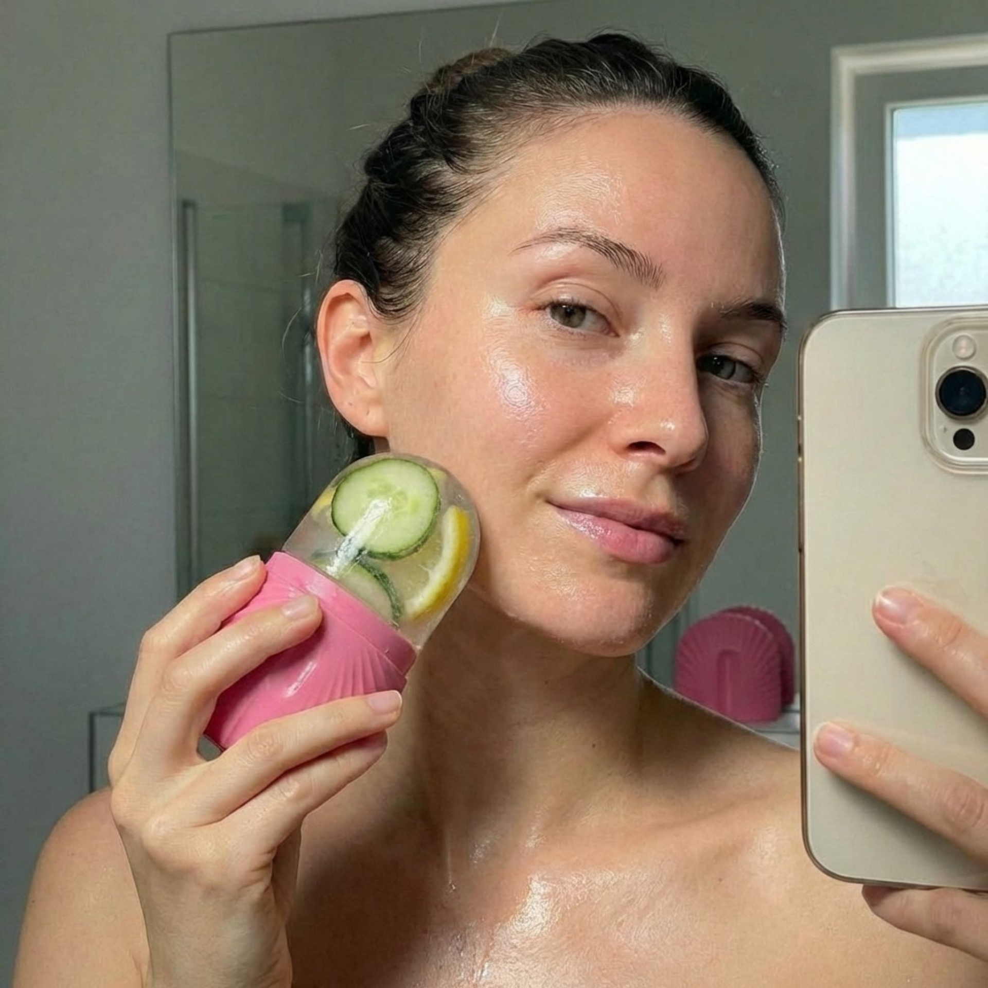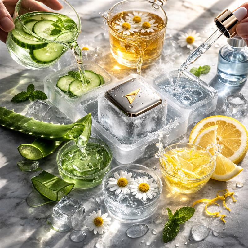 Mit Wasser oder einer individuell gewählten Flüssigkeit befüllen, über Nacht einfrieren und morgens 1–2 Minuten sanft über Gesicht und Hals führen.